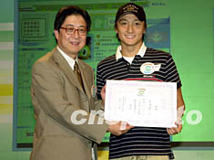 歌星方力申9月5日出席香港电台联同教育署举行「教育电视2002-2003新学年启播典礼」。助理广播处长张文新向方力申致送邀请状,邀请他参与演出教育电视节目。邓庆乐 摄
