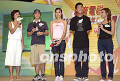 四位乐坛年青歌手方力申、李彩桦、余文乐、方皓玟(左二起)9月5日出席香港电台联同教育署举行的「教育电视2002-2003新学年启播典礼」。他们将有机会参与演出教育电视节目,教育电视节目将于9月9日起正式启播。邓庆乐 摄