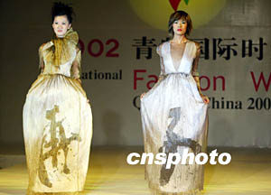 日本时装设计师古川云雪九月在青岛国际时装周上,将女性时装展示为美瓷花瓶般的韵味。作者:毛建军