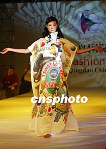 日本时装设计师古川云雪九月周末在青岛国际时装周上,展示以鸟类与青岛啤酒罐为图案的作品,独具匠心。 作者:毛建军
