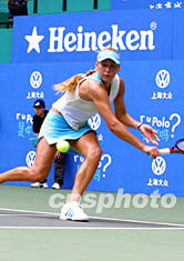 上海大众POLO公开赛九日正式开赛,俄罗斯选手库尔尼科娃在首轮双打比赛中和中国台北的李惠芝搭档,以2比1击败意大利扎内蒂姐妹组合,顺利晋级下轮比赛。图为库尔尼科娃在比赛中。作者:汤彦俊