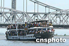 九月,朝鲜人民共和国的游船装载着众多游客在鸭绿江上游览。作者:赵振清