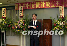 中国新闻社成立五十周年庆祝招待会十日晚在东京隆重举行。图为中国新闻社社长助理周锋在招待会上致词。中新社图