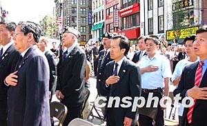 美国东部时间九月十一日中午,纽约华人在华埠的林则徐广场举行献花仪式,悼念“九一一”罹难者。作者:黄克锵