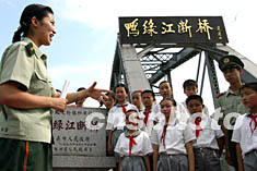 担负警卫丹东鸭绿江“断桥”的丹东边防检查站的武警官兵,在完成警卫任务的同时,还向参观的少年儿童介绍该桥的历史背景和重要性。该桥在五十年代的朝鲜战争中曾被美国飞机炸断,后来一直是中朝两国间的交通要道。作者:赵振清