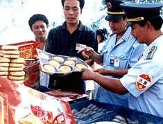 中秋节前夕,山东枣庄的工商人员在集市上检查月饼质量,以保证消费者在中秋节吃到质量信得过的月饼。 作者:高贵军