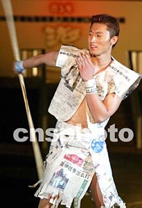 一名中国内地男模展示自己用报纸制作的个性时装,别开生面。毛建军 摄
