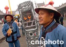 九月山西平遥国际摄影大展上,外国手机广告卡通与仿古衙役相聚助兴。作者:贾国荣