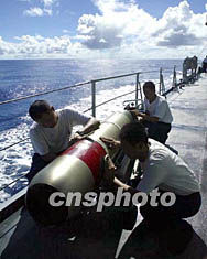 中国海军环球航行访问舰艇编队九月二十日已满载各国人民和军队的友谊,返航到祖国领海,经各系统全面检查、检验证实,舰艇机械、武器装备和舰容均处于良好状态。图为水兵对水中兵器进行检测保养。王松岐 摄