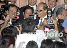 香港潮属社团9月23日晚举行庆祝中华人民共和国国庆酒会,长实集团主席李嘉诚出席时从头到尾都成为传媒追逐的对象。任晨鸣 摄