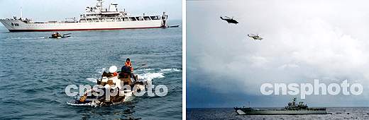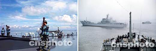 左图:登陆兵在舰上进行防空演练。 右图:舰艇编队在航行中演练。