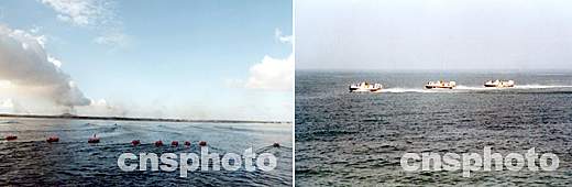左图:新型气垫船冲击上陆。 右图:舰艇在海上进行队形变化。