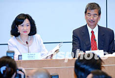 香港保安局局长叶刘淑仪(左)、署理保安局常任秘书长汤显明,9月24日在政府总部公布有关《基本法》第二十三条的谘询文件。洪少葵 摄