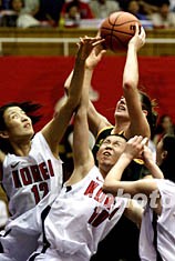 三名韩国球员(白色球衣)阻挡澳大利亚十一号杰克逊(绿色球衣)投篮。在二十五日进行的十四届女篮锦标赛三四名决赛上,澳大利亚战胜韩国夺得季军,杰克逊一人独得三十二分。作者:郑萍萍