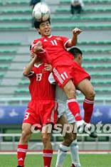 图为中国队十一号孙祥头球攻门。潘索菲 摄