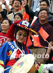 图为中韩球迷共同为中国足球队助威。潘索菲 摄