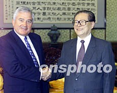 中国国家主席江泽民二十七日在北京会见美国IBM公司董事长郭士纳。作者:满会乔