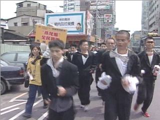 中新网9月29日电 台中市28日有一场马拉松比赛,参赛者比一般选手更辛苦,因为他们必须模仿影星成龙在新片中的造型,大热天里身穿燕尾服跑一段路,还要将漏气的脚踏车轮胎打满气,再骑着脚踏车到终点,才能成为赢家。