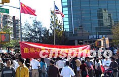 当地时间九月二十九日中午,在热闹的纽约法拉盛缅街上,飘扬起一面五星红旗。纽约华人今天在此举行升旗仪式,庆祝中华人民共和国成立五十三周年。作者:赵海燕