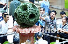 2002年广州西关珠宝玉器展销会三十日在荔湾广场揭幕,展销会上一座重三吨的巨型玉雕球“新世纪、新广州”吸引了众多市民驻足观看。作者:梁永强