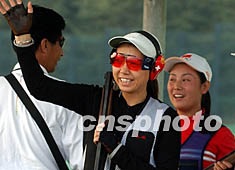 中国选手高娥(左)二日在韩国昌原举行的女子多向飞碟决赛中战胜各路好手,赢得金牌。图为高娥获胜后向观众致意。作者:武仲林