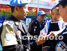 北京市公安局出入境管理处警察,六日佩戴着联合国维和警察标志,在公园向市民展示中国警察在联合国维和行动中的地位,以增强老百姓的自豪感。作者:宋吉河