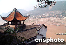 具有1700多年历史的云阳张飞庙,伴随三峡工程二期水位的逼近,2002年10月8日上午10点正式闭馆。重庆云阳县文管所和迁建单位以办完交接手续,并开始对张飞庙进行拆迁,标志着建国以来全国最大规模的文物搬迁工程正式启动。图为张飞庙结义楼全景。巨建兵 摄