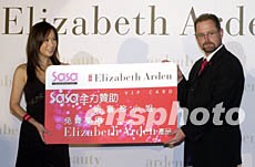 香港影星刘嘉玲10月9日在香港出席伊莉莎伯雅顿香水委任港澳总代理典礼。伊莉莎伯雅顿亚太执行董事Greg Kinch先生向影星刘嘉玲进行颁赠赞助该品牌产品仪式。邓庆乐 摄