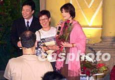 第十六届澳门国际音乐节九日晚在澳门玫瑰堂前地举行“蔡琴、费玉清玫瑰之约”艺术家之约活动,许多蔡琴的歌迷纷纷走上临时舞台向她献上玫瑰花并舆她合影。李刚 摄