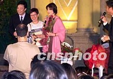 第十六届澳门国际音乐节九日晚在澳门玫瑰堂前地举行“蔡琴、费玉清玫瑰之约”艺术家之约活动,许多蔡琴的歌迷纷纷走上临时舞台向她献上玫瑰花并舆她合影。李刚 摄