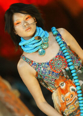 10月09日,在巴黎2002至2003年春夏成衣展上,著名模特吕燕展示俄国设计者的作品。