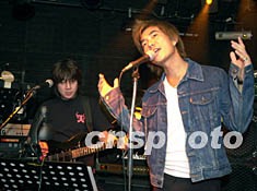 台湾歌星任贤齐,10月13日一头金发和牛仔装在香港一家以男士为主的酒吧举办的“举杯Party”上演唱。中新社图 任晨鸣 摄