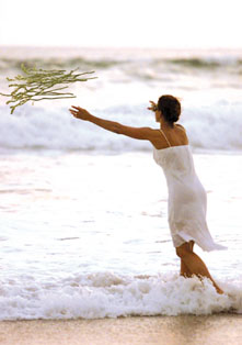 一名女子追悼巴厘岛爆炸死者时把一串鲜花扔到海里