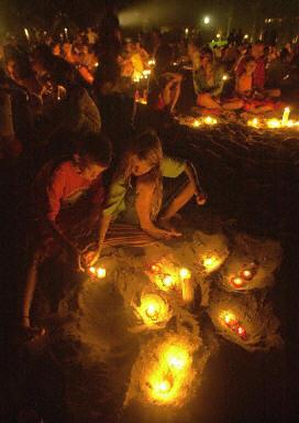 10月14日,在巴厘岛的外国儿童点燃蜡烛为爆炸中的受害者祈祷。