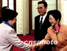 全国人大常委会委员长李鹏携夫人朱琳十六日在北京会见越南前国家副主席阮氏萍(左)一行。作者:郑萍萍