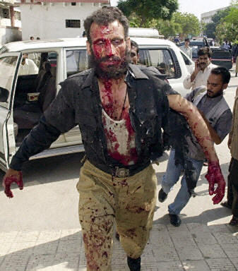 巴基斯坦警方16日说,巴南部城市卡拉奇的警察局和其它政府机关的多个办公室当天接连发生邮包炸弹爆炸案,虽未造成人员死亡,但至少有9人受伤。图为被邮包炸弹炸伤的警察。