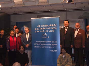 江泽民主席访美前夕,中国国务院新闻办在美国首都华盛顿的威尔逊中心举办“历史的记忆”展览,江泽民为在“二战”中“驼峰航线”上牺牲的美国飞行员吉米.福克斯题词。中美两国老兵和当年参加救援的中国村民代表及其他们的亲属在题词边合影。