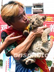 十九日中午,参加第十三届全国书市的“影视大鳄"”邓建国来到福州国家森林公园,,将上午在中亭街签名售书所得款全部捐给国内仅有的一只虎狮兽“花花”,同时认养“花花”。作者:杨婀娜
