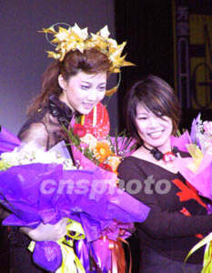 二00二广东(秋季)时装周,十九日晚在广州花园酒店降下帷幕,获奖设计师与模特接受现场观众祝贺。作者:刘卫勇