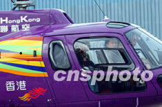 香港演艺界“大哥”成龙,10月21日身着唐装乘坐直升机出席在启德旧机场举行的《千机变》电影记者会,为英皇集团投资的科幻电影造势。洪少葵 摄