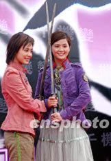 香港英皇集团旗下当红明星Twins, 10月21日在启德旧机场《千机变》电影记者会上手持除妖斩魔剑为新片作造型。洪少葵 摄
