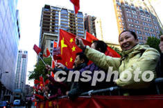 22日,旅美华人华侨汇聚在芝加哥市中心里兹酒店前,在秋风中挥舞国旗,热烈欢迎中国国家主席江泽民首次访问芝加哥。作者:王瑶