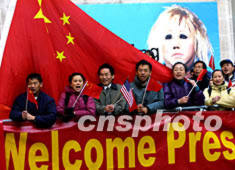 江泽民主席应布什总统邀请访问美国,22日抵达芝加哥奥黑尔机场,受到当地华人华侨的热烈欢迎。作者:王瑶