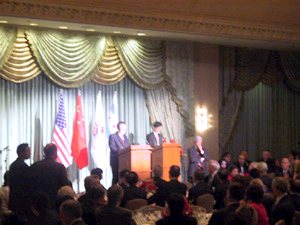 当地时间二十二日晚,江泽民和夫人王冶坪出席了瑞恩州长、芝加哥市政府和外交关系委员会举行的盛大欢迎晚宴。伊州、芝市各界知名人士四百多人出席了宴会。图为江泽民在晚宴上致辞。中新社记者 吕振亚 摄