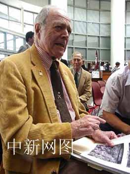 美中时间二十二日下午,在德克萨斯州农工大学布什总统图书馆举行的吉米·福克斯铜像揭幕仪式上,美国前飞行员古蒂亚回忆二战期间与战友福克斯支援中国抗击日本侵略军的情景。福克斯一九四三年在中国执行飞行任务时坠机牺牲。作者:陈建