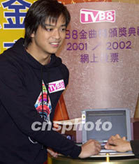 歌星陈奕迅10月23日在香港出席《TVB8金曲榜颁奖典礼2001/2002》记者会,率先为《TVB8金曲榜颁奖典礼2001/2002》上台在网上为喜爱的歌曲投票。邓庆乐 摄