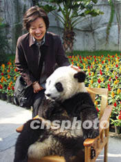 香港周凯旋基金会二十四日向成都大熊猫繁育研究基地捐赠五十万元,终身认养两只大熊猫。图为香港周凯旋基金会的代表张培薇女士高兴地与大熊猫合影留念。作者:鲁彦