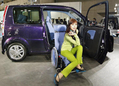 10月29日,在东京汽车展览会新闻预展会上,模特展示新型概念车。图为一款为方便轮椅上下车设计的新型车。