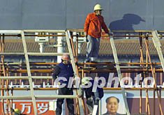 北京工人们十月底在天安门广场安装大型字牌,准备迎接中共十六大的召开。作者:满会乔