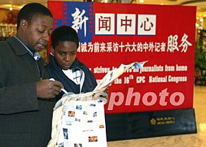 走进宾馆,便可看到为采访十六大的中外记者们设置了专门停车区域,进入大堂,映入眼帘的是一块大型看板,上面用中英文书写着“新闻中心竭诚为前来采访十六大的中外记者服务”,其中“服务”两个字尤为醒目。
